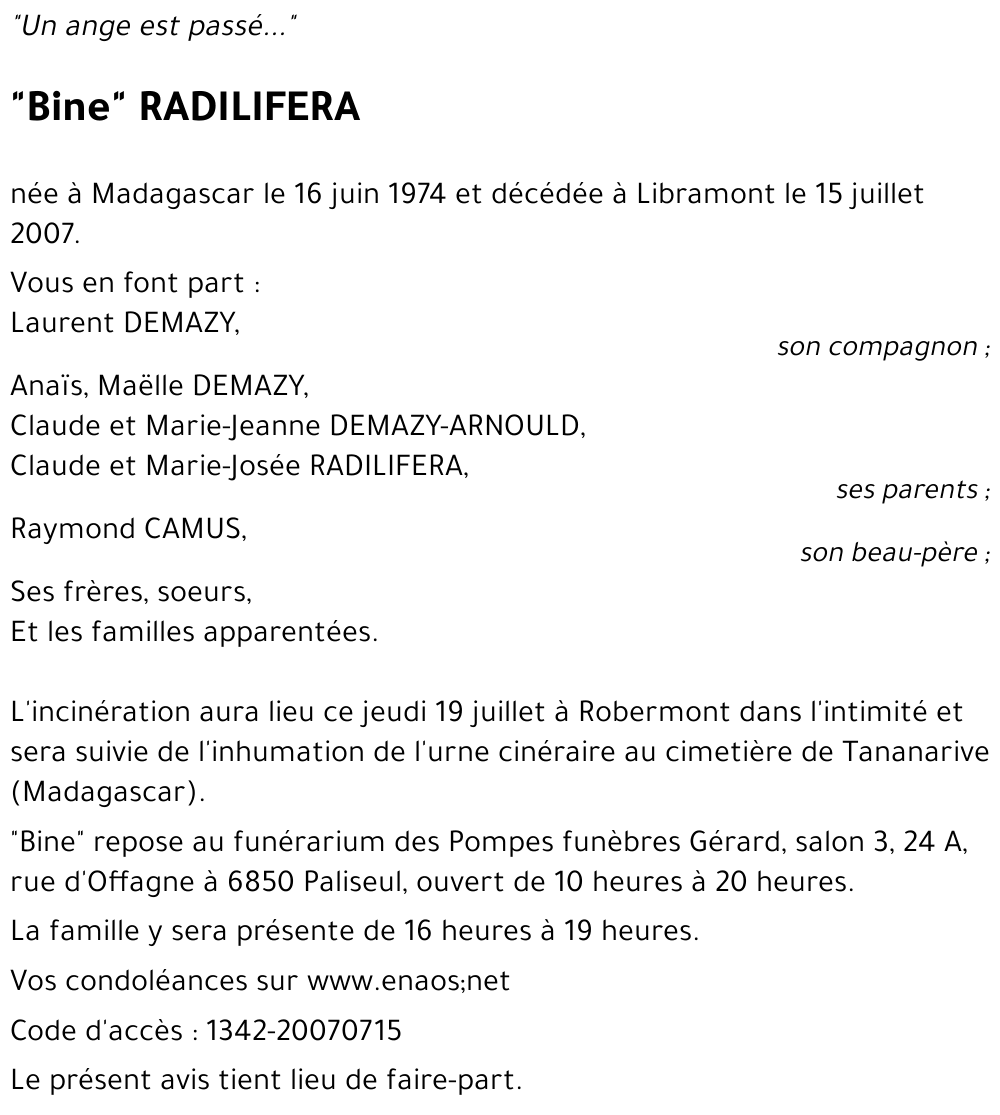 Date de décès 15/07/2007 Libramont-Chevigny