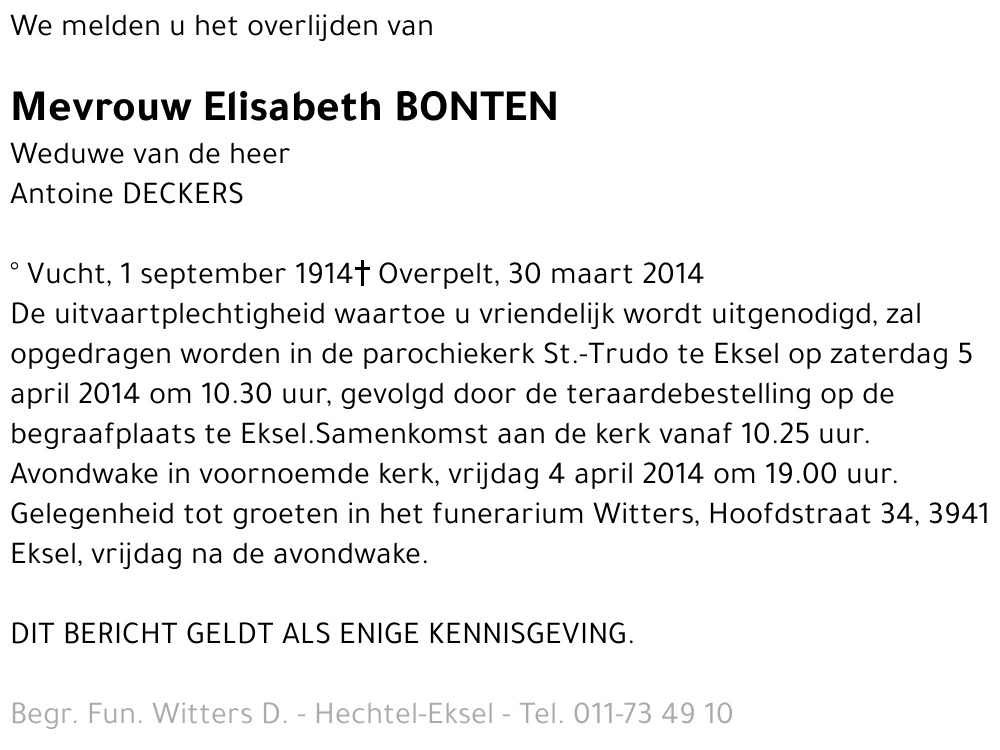 We keken allemaal uit naar je 100ste verjaardag! Spijtig dat het niet heeft mogen zijn. Maar één ding zullen we blijven koesteren Bomma: Wie kan er zeggen dat hij/zij een bomma heeft gehad die elke week ging kienen, bijna volledig zelfstandig woonde, die elk jaar een mooi feest gaf en iedereen graag zag dat was jij Bomma!!!! We zullen je allemaal missen rust zacht!!!!
