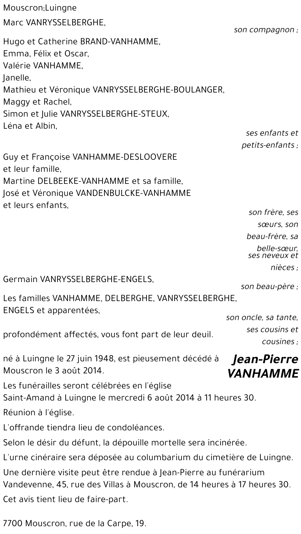 Mes plus sincères condoléances à toute la famille Vanhamme et Vanrysselberghe. Et plus particulièrement à Valérie, Catherine et Marc.