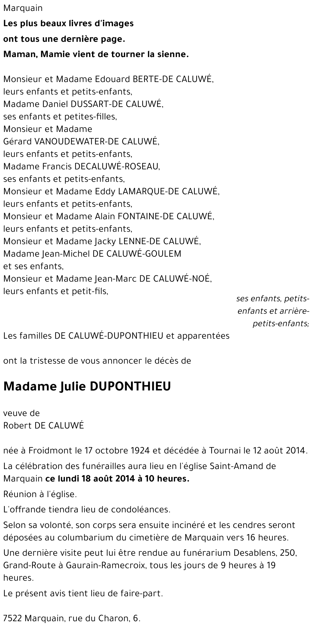 Étant actuellement à Lourdes, c'est aux pieds de la Sainte Vierge que nous prierons tout particulièrement pour votre maman et mamy. Nous sommes désolés de ne pouvoir assister à ses funérailles. À toute la famille, nous présentons nos sincères condoléances.