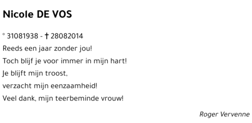 Nicole ...toen ik boodschappen deed voor jpu en je man kwam ik met plezier vij jullie...na het overllijdenn van je was er een serieuze leegte in huis ...rogeetje kon het verlies geen plaats geven .. hij was blij dat ik nog steeds bij hem kwam met boodschappen en een babbeltje te doen...toen ik vandaag roger nie kon bereiken via gsm en telefoon heb ik ziekenhuizen gebeld of hij daar was maar hemaas ...ik heb dan de hulpdiensten gebeld en het slechte nieuws gekregen dat ze je man hebben gevonden ...het doet me zoveem verdriet maar ergens wem blij dat ik gebeld heb naar de hulpdiensten...ik hoop dat jullie elkaar daar boven terug tegen komen slaapzacht nicole en roger ..zal jullie missen