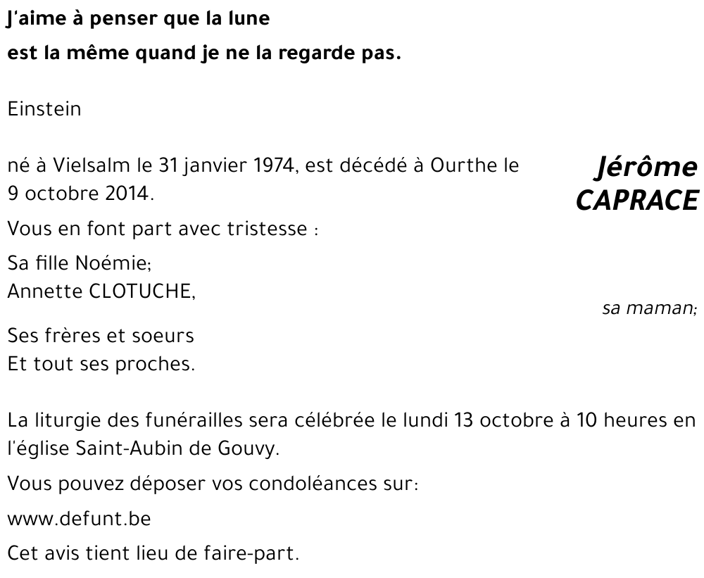 Toutes nos condoléances à toute la famille. Je t'ai toujours apprécié Jérôme, tu vas nous manquer. Pierre Georis et sa famille.