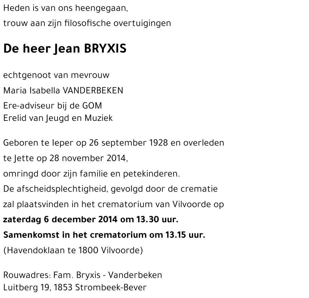 Na de opruststelling van Jean verloren wij mekaar uit het oog, zoals dat in een mensenleven vaker voorkomt dan wij zouden willen. Ik denk evenwel met veel genegenheid terug aan de beginjaren van de instelling die wij, samen met andere collega's van toen, vorm en inhoud gaven. Het is één van die weinige overgebleven collega's die mij het droeve nieuws meldde. Ik bied alle nabestaanden mijn oprechte deelneming aan.
