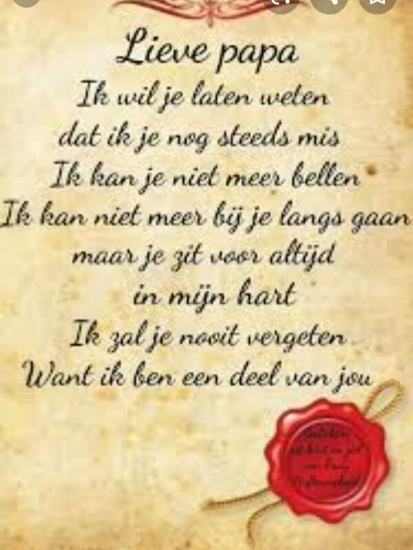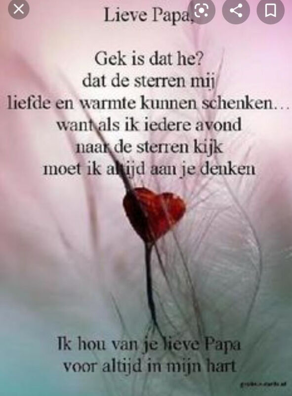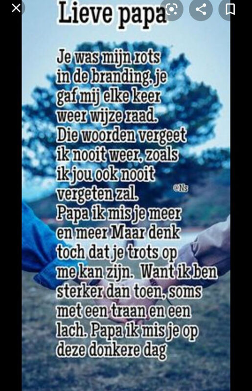 Papan vandaag 3 jaar geleden stierf je in mijn armen. Ik had je beloofd ik blijf altijd bij je. Lijk het Frans liedje van je zegt in jou spiegelbeeld wil ik streven.daar heb ik mijn woord voor je gehouden. Ooooo papan wat mis ik je zo. Hou van je xxx je mop voor altijd Laura.
