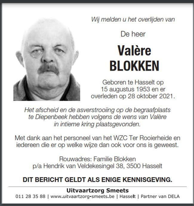 Onze oprechte deelneming bij het overlijden van uw broer en nonkel Valère .