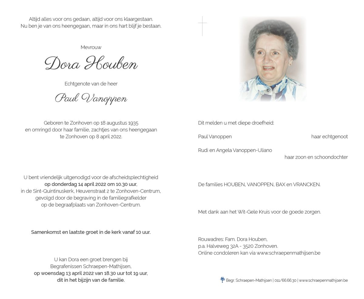 Oprechte deelneming bij het overlijden van Dora. Moge zij blijven verder leven in mooie herinneringen. Veel sterkte.