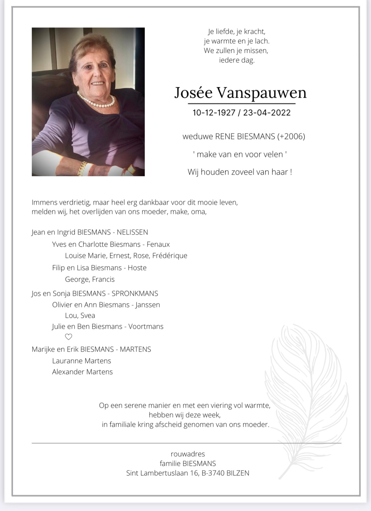 Namens ons wensen we jullie veel mooie herinneringen aan jullie mama, grootmoeder, familielid. Ongeacht de leeftijd, is een dierbaar iemand afgeven moeilijk.