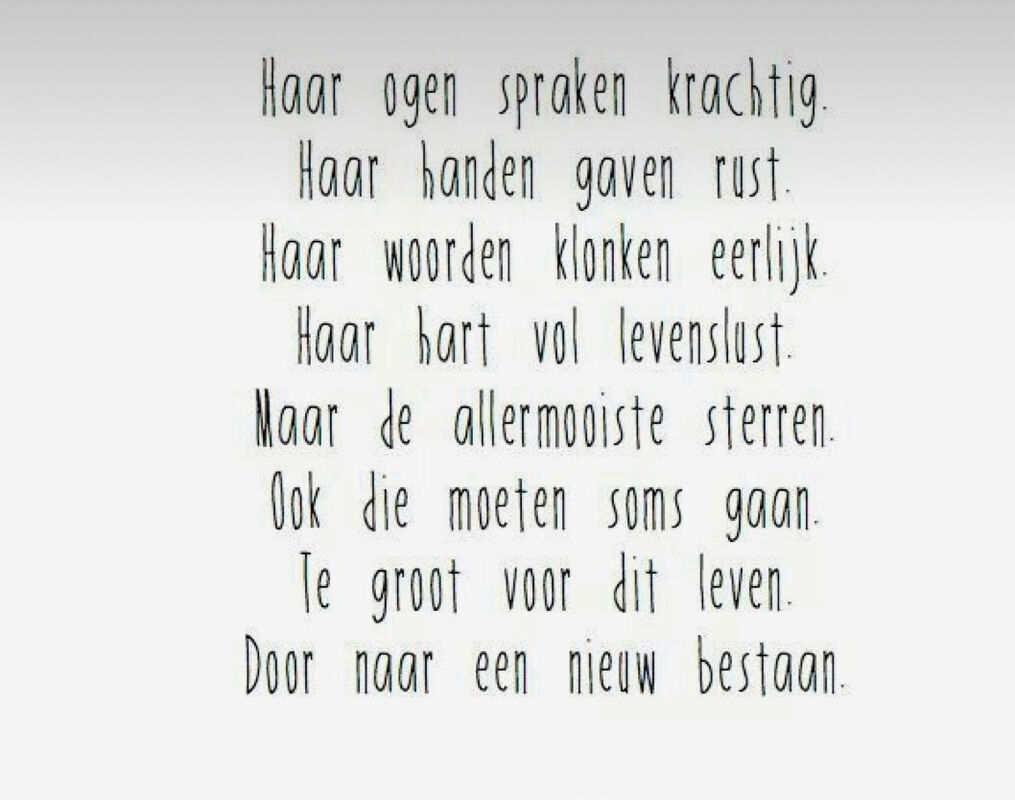 Nooit vragen, nooit klagen,haar pijn in stilte dragen.Haar handen hebben voor ons gewerkt, haar hart heeft voor ons geklopt, haar ogen hebben ons tot het laatst gezocht.