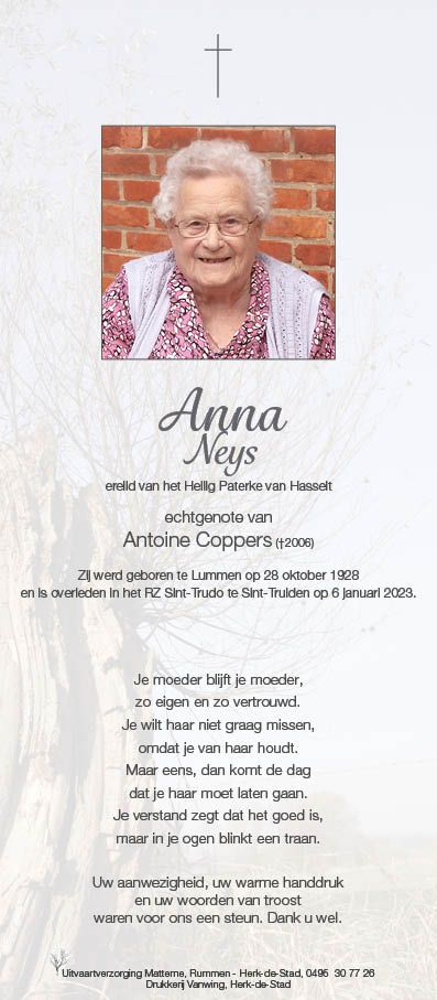 Beste familie, wij delen in jullie verdriet om de dood van Anna,,jullie moeder en grootmoeder. Sterkte;