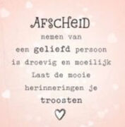 Jammer genoeg kan ik er niet bijzijn . Toch wil ik jullie heel graag mijn medeleven betuigen met het overlijden van Frans en papa. Dan wil ik jullie zeggen dat ik veel respect heb voor jullie wat jullie allemaal voor hem gedaan hebben .