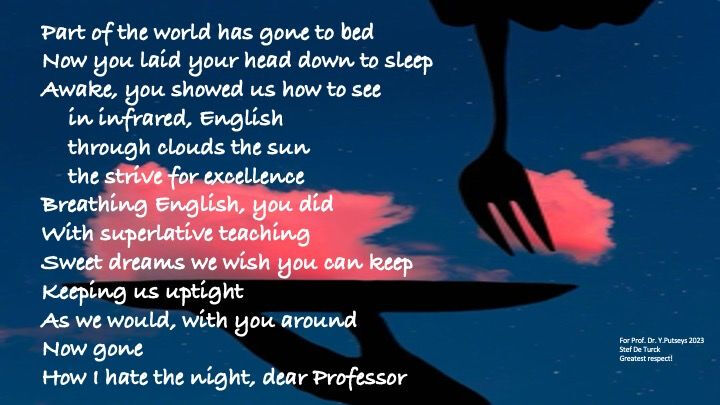 Dear Professor Putseys, thank you for loving, living and breathing the English language, thank you for your dedication and commitment, thank you for scaring me into aiming for perfection, thank you for your lasting impact on my life.