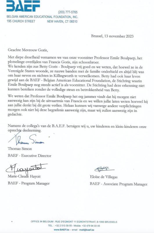 Namens de collega's van de Belgian American Educational Foundation betuigen wij u, uw kinderen en klein-kinderen onze oprechte deelneming.