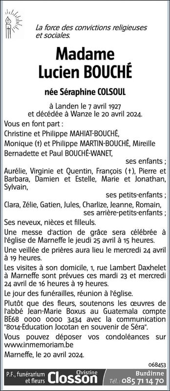 Marie-Claire et Willy Frippiat présentent leurs sincères condoléances à la famille endeuillée.