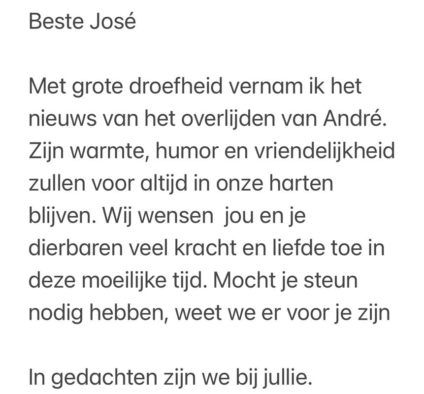 Het heeft zo moeten zijn dat ik laatst nog bij jullie ben geweest na zovele jaren. Ik heb het telaat gehoord van André zijn overlijden en niet op de begroeting kon zijn.En inderdaad hij was altijd een lachende kerel zoals ik hem kende. Daarom mijn oprechte innige deelneming.💐