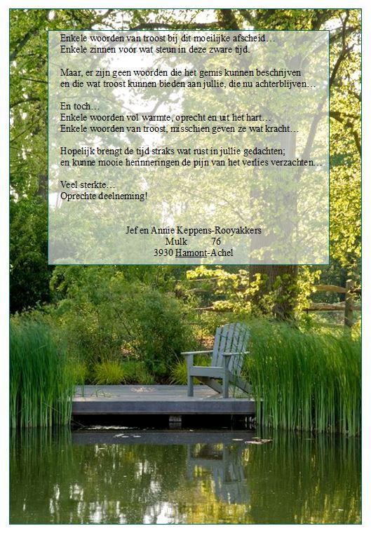 Woorden schieten tekort. Woorden kunnen de leegte en het gemis niet vullen. Hopelijk vinden jullie de kracht om alle verdriet een plek te geven en vinden jullie troost in mooie herinneringen. Veel moed, kracht, sterkte en troost. Oprechte deelneming! Jef en Annie Keppens-Rooyakkers, Mulk 76 -Hamont