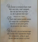 Ik hoorde niets meer. Geen vogels die zingen, geen wind die waait. Alleen totale stilte. Maar de mooie herinneringen zullen ons altijd bijblijven . Fijn je mogen gekent te hebben in mijn leven .
