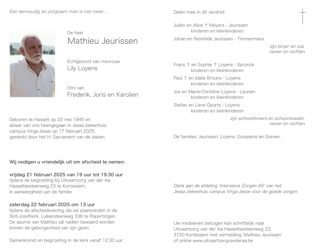 Oprechte deelneming bij het overlijden van uw echtgenoot, vader en opa. Mathieu was een aangename, behulpzame (KB) collega.