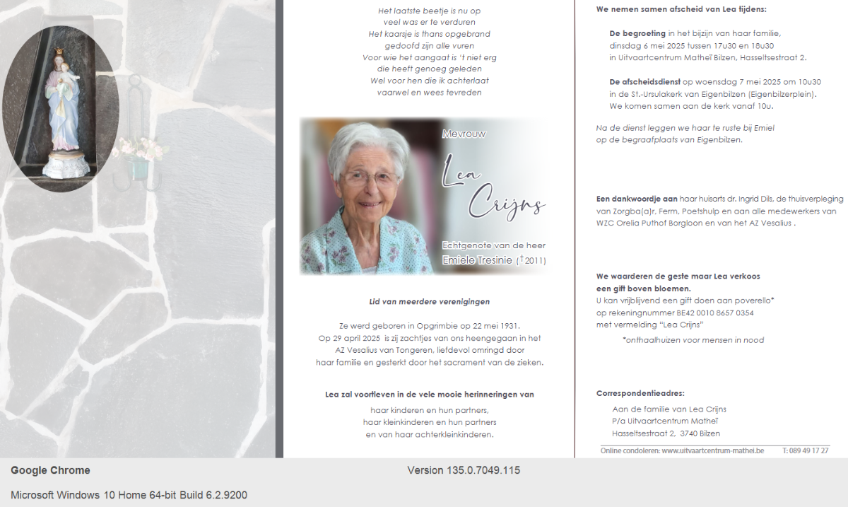 Mijn oprechte deelneming bij het overlijden van uw moeder en grootmoeder. Zij was de moeder van alle Limburgse medewerkers in Banneux, een monument.
