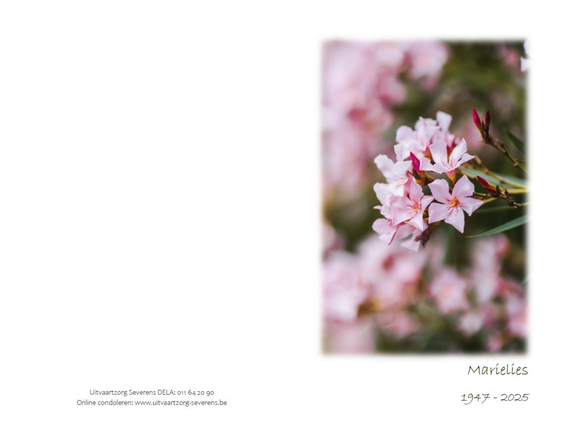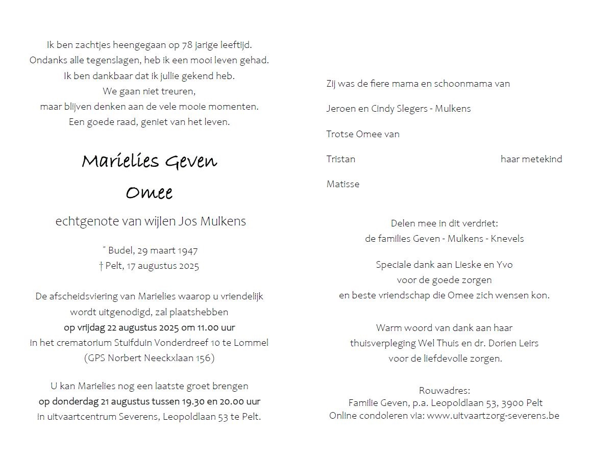 Ik ben zachtjes heengegaan op 78 jarige leeftijd.Ondanks alle tegenslagen, heb ik een mooi leven gehad.Ik ben dankbaar dat ik jullie gekend heb.We gaan niet treuren, maar blijven denken aan de vele mooie momenten.Een goede raad, geniet van het leven.