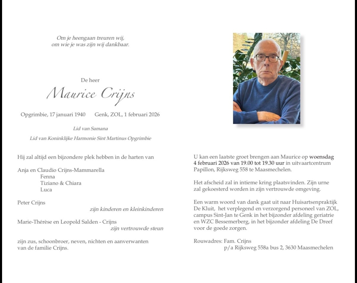 Elk afscheid is de geboorte van een herinnering. En ik heb er vele en goede, ik zal ze koesteren. Veel sterkte bij het verlies van Maurice, die ook mijn peter was en wiens naam ook in één van mijn voornamen prijkt en daar ben ik fier op!