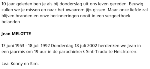Lieve Jean, bijna 28 jaar geleden moest je gaan, maar er wordt nog zo vaak aan jou gedacht. Nog altijd geef je Kim, Lea&Kenny zoveel kracht. Je leeft verder in hen, vol trots kijk je over hun schouders mee, jullie liefde voor elkaar gaat nooit verloren, integendeel, jullie zijn zielsverwanten 4ever!