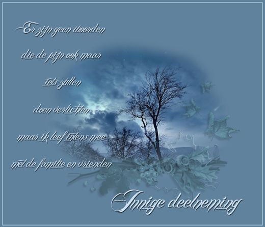 We betuigen ons innig medeleven. Wees getroost door de vele mooie herinneringen die je zult bewaren en koesteren.