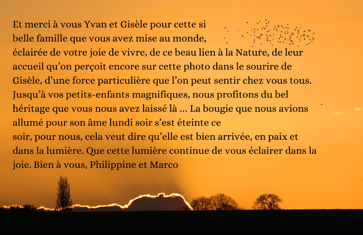 Nos sincères condoléances à vous tous, Yvan, les enfants et petits-enfants, rencontrés au gré de la Vie et des fêtes chez Marie et Charles. Que la Lumière et la Joie de Gisèle continuent à vous nourrir ...