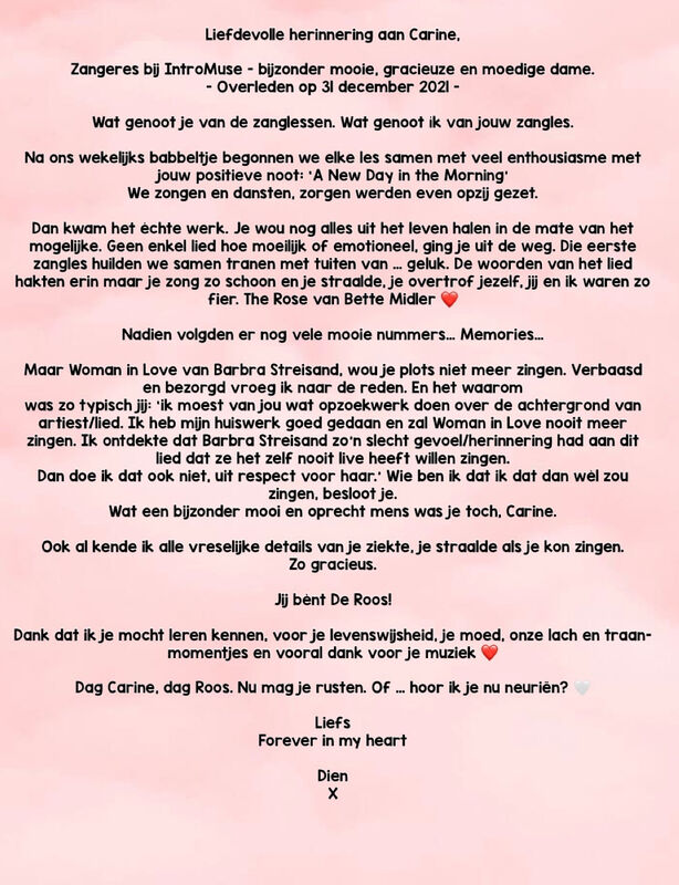 Carine had in ons koor gezongen en ze werd geapprecieerd. We zullen ze nooit vergeten!