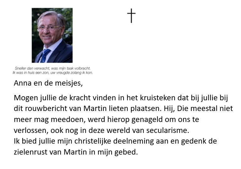 Dat de fijne momenten die gij samen met Martin hebt beleefd, u nu troost en sterkte geven in deze zware dagen.