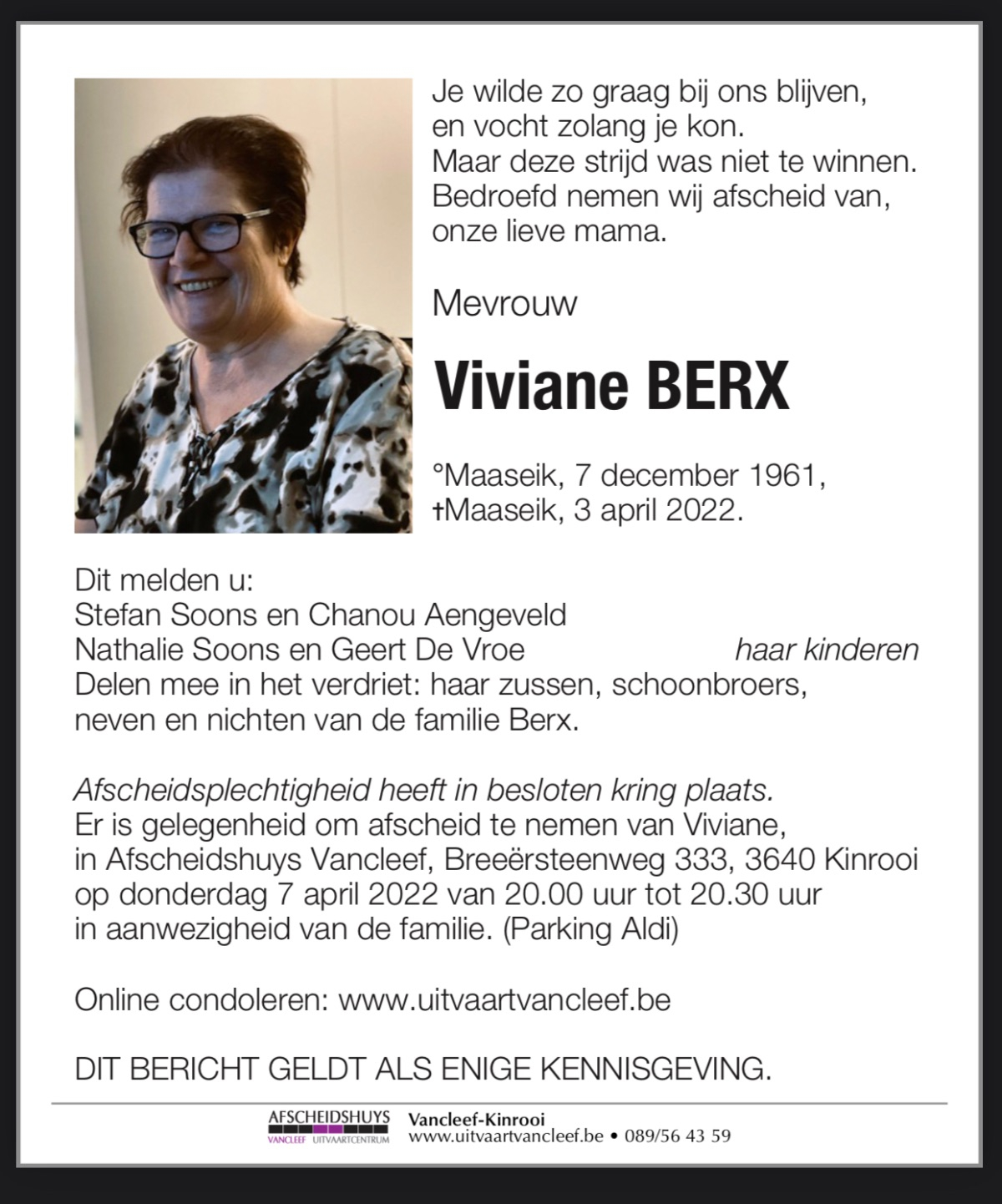 Ons oprecht medeleven aan de naasten van Viviane