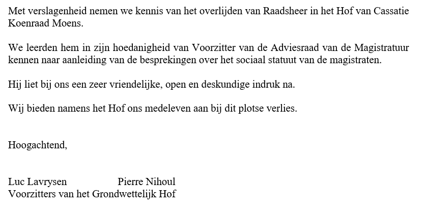 Met verslagenheid nemen we kennis van het overlijden van Raadsheer in het Hof van Cassatie Koenraad Moens.