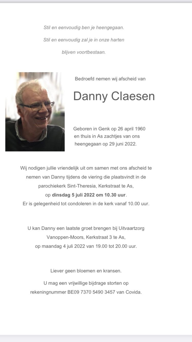 Danny zal voor altijd in jullie harten zijn, warm zijn de herinneringen, groot is het verlies.