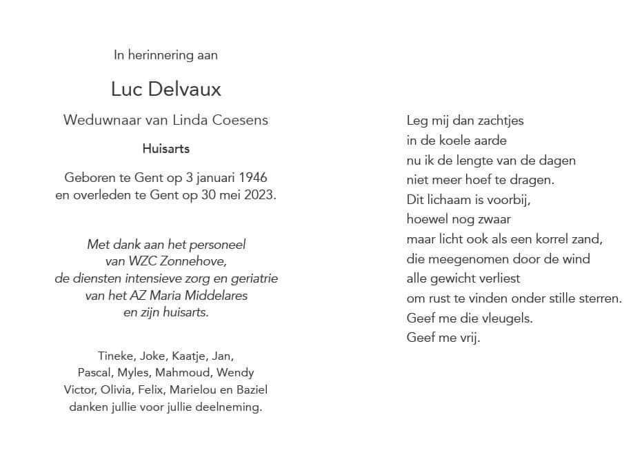 Mijn innige rouwbetuiging bij het overlijden van jullie vader; grootvader Luc Delvaux.