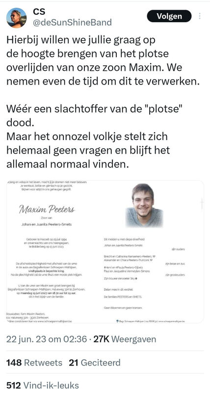 @desunshineband op Twitter (18.700 volgers) misbruikt dit overlijden om anti-vaxx praatjes te verspreiden.