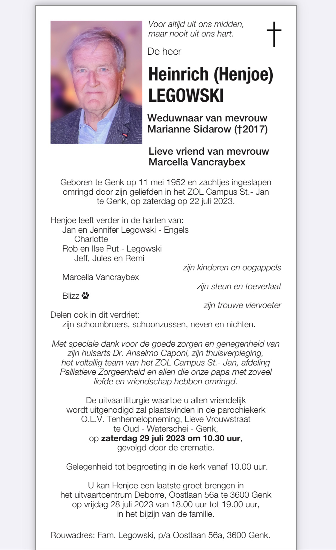 Tijdens ons verlof in het buitenland heb ik het spijtige bericht ontvangen. Hierdoor heb ik ook geen afscheid komen nemen van Henjoe. Nogmaals onze oprechte deelneming en veel sterkte. Is het mogelijk om een rouwprentje te krijgen? Adres: Willy Gernaey, Dwarsstraat 34 3590 Diepenbeek