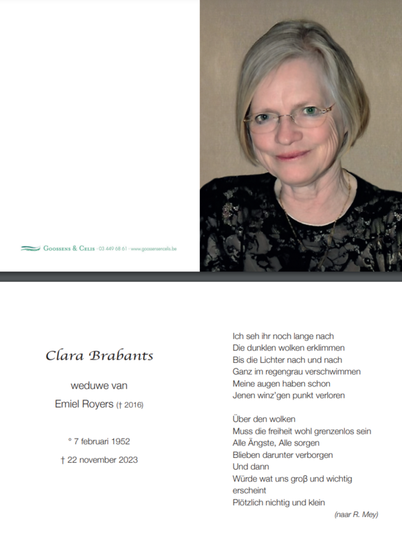 Beste familie, mijn oprechte deelneming bij het overlijden van Clara. Tijdens onze schooljaren waren we dikke vriendinnen. Helaas zijn we elkaar later uit het oog verloren. Ik bewaar bijzonder fijne en mooie herinneringen aan haar,
