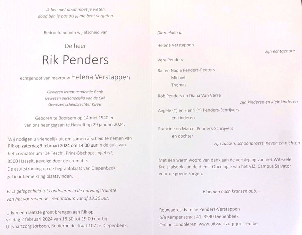 Met grote droefheid vernam ik het overlijden van Mijnheer Rik Penders. Hij was een geweldige leraar die een diepe impact op mij had. Een inspirerende vakdocent Woord! Ik heb veel van Mijnheer Penders geleerd. Hij zal gemist worden,