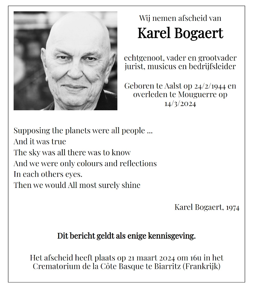 In een verre maar zeer dankbare herinnering aan Karel bied ik de familie mijn deelneming aan. Ik koester nog steeds de zeer moeilijke periode voor ons beide op de Blekersdijk in Gent tussen een impressionante verzameling Blues-platen terwijl we de laatste zaken afwerkten voor zijn Blues-lexicon...