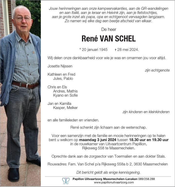François Segers en Guy-Anne Boffé delen oprecht mee in het verdriet dat Mevrouw Van Schel, haar kinderen, schoonkinderen en kleinkinderen overkomt bij het overlijden van haar man, hun papa en opa. Zij hopen van harte dat jullie troost bij elkaar kunnen vinden.