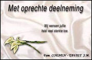Ik wil bij deze mijn oprechte deelneming uitspreken. Woorden van troost mogen dan wel verdwijnen als sneeuw voor de zon, ze willen steun zijn in het verlies van jullie dierbare.