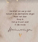 Als een vlinder hoog gevlogen, omringd door liefde heengegaan.Afscheid is niet het einde, herinneringen blijven bestaan.Het allermooiste zit in je hart.