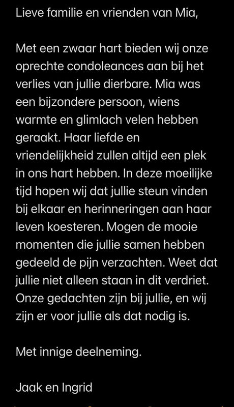 Met een zwaar hart bieden wij onze oprechte condoleances aan bij het verlies van jullie dierbare. Mia was een bijzondere persoon, wiens warmte en glimlach velen hebben geraakt. Haar liefde en vriendelijkheid zullen altijd een plek in ons hart hebben.