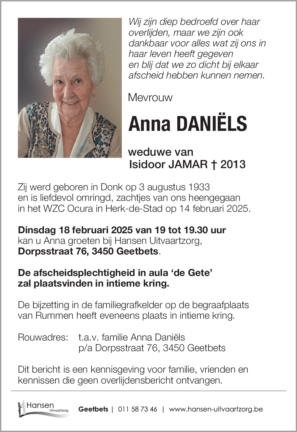 Wij zijn diep bedroefd over haar overlijden, maar we zijn ook dankbaar voor alles wat zij ons in haar leven heeft gegevenen blij dat we zo dicht bij elkaar afscheid hebben kunnen nemen.