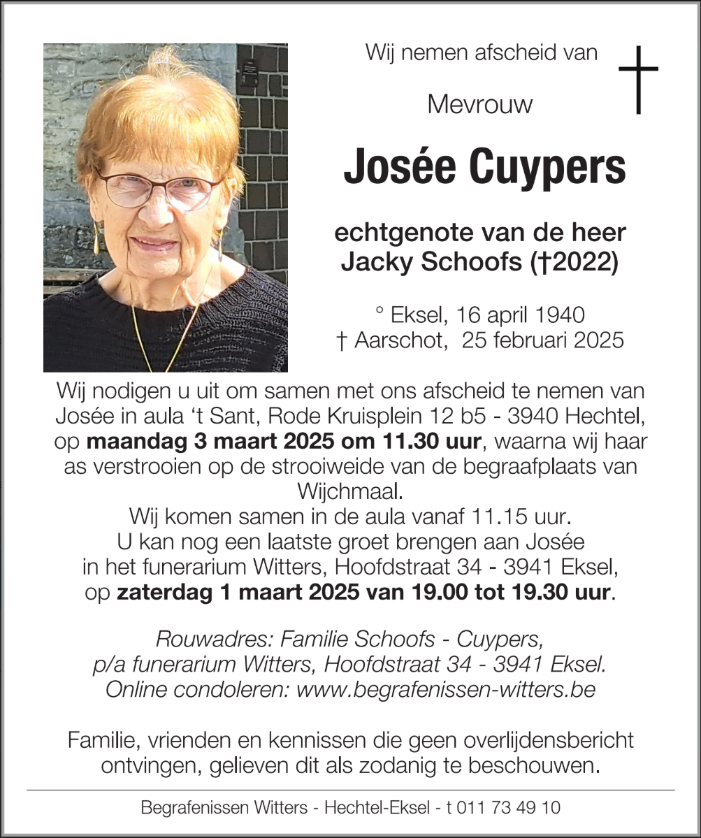 De familie Cuypers-Snoeks biedt haar blijken van oprecht christelijk medeleven aan de beproefde familie en wenst hen veel sterkte toe in de komende dagen