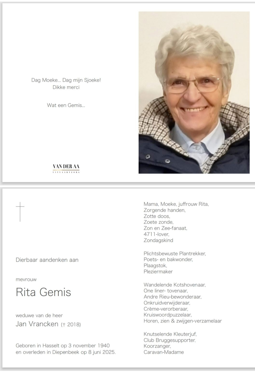 Wij delen in uw droefheid bij het heengaan van Rita. Wij hebben bijzonder goede herinneringen aan Rita, zowel van in het schoolgebeuren, van bij wandelingen en gesprekken en van in het zangkoor. Veel sterkte voor de familie.