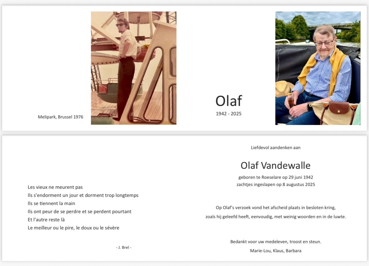 Dank aan Olaf voor de vele opportuniteiten die hij me bood ten tijde van de Meli als student.Een mooi gebaar van een mooi mens. Voor jou M-Lou , Barbara en Klaus en familieledenwens ik jullie allen de kracht om jullie dierbare los te laten, in dankbaarheid voor zijn boeiend.Uit vriendschap, Christe