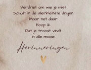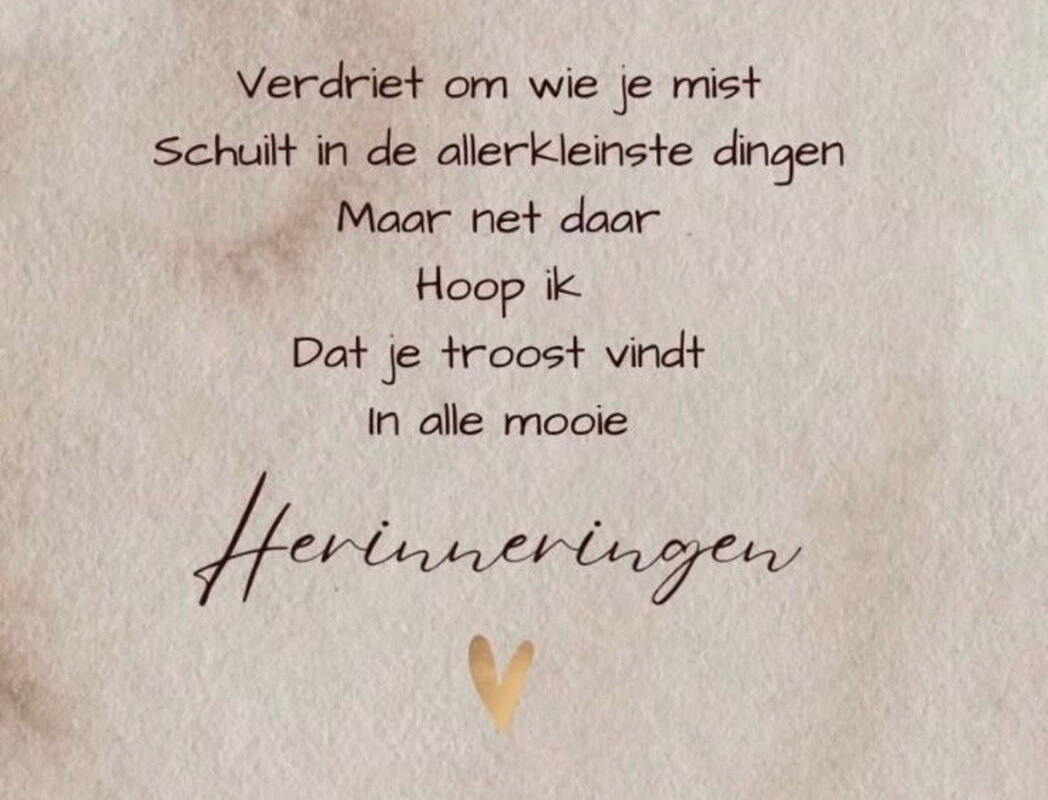 Ween ik nu omdat je zo ver van mij vandaan bent? Of kan ik nog glimlachen omdat jij naast mij geleefd hebt? Sluit ik mijn ogen en bid ik dat je terug zou komen? Of kijk ik op en bewonder wat jij voor ons achterliet? Is mijn hart zo leeg omdat ik je niet meer zien kan? Of is het zo vol liefde, omdat je in gedachten bij ons blijft?