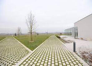 L’entrée de la drève d’accès est marquée d’un totem à l’effigie des Blancs Arbres. Les parkings P1 et P2 sont disponibles devant le crématorium.