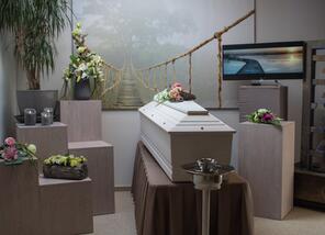In onze aula kunnen wij zowel afscheid van een urne als afscheid van een kist nemen. Hier verzorgen wij afscheidsplechtigheden tot 100 personen. We kunnen deze ruimte ook opsplitsen en voor 50 personen plechtigheid houden en aansluitend voor 50 personen koffietafel aanbieden.