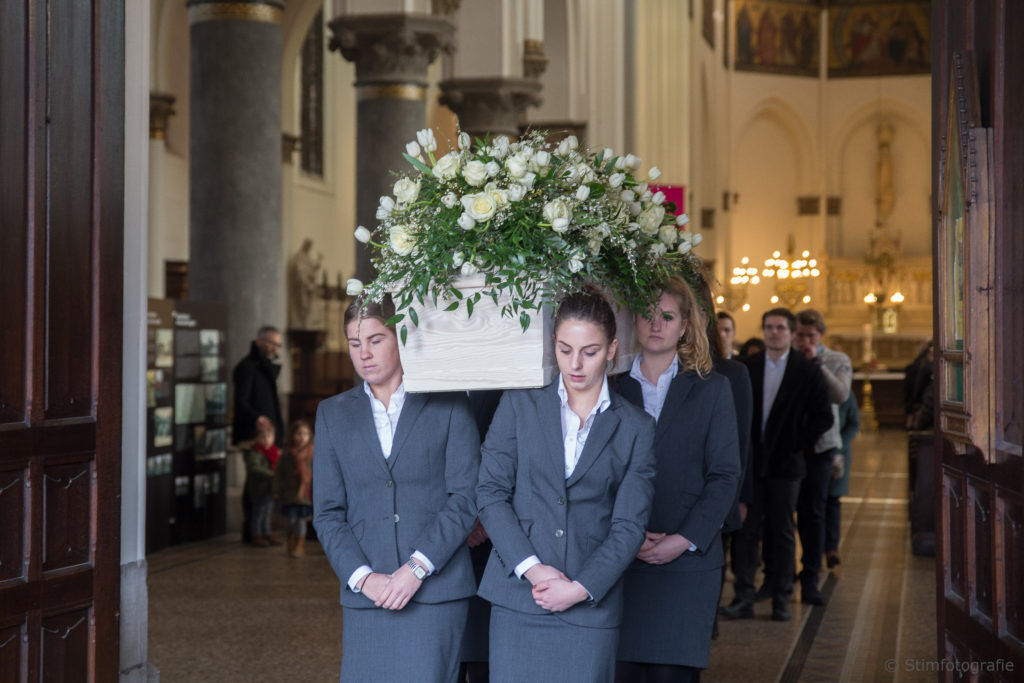 Het leven begint altijd bij een vrouw. Daarom bieden wij ook de mogelijkheid aan om de kist te laten dragen door vrouwen. Zo is de cirkel rond. De keuze ligt echter volledig bij jullie. Ons professioneel team heeft zowel mannen als vrouwen als dragers/draagsters. Het is ook mogelijk dat u zelf de kist of urne mee wil begeleiden. Alles moet mogelijk zijn om het afscheid op een eigen persoonlijke manier te verwezenlijken.